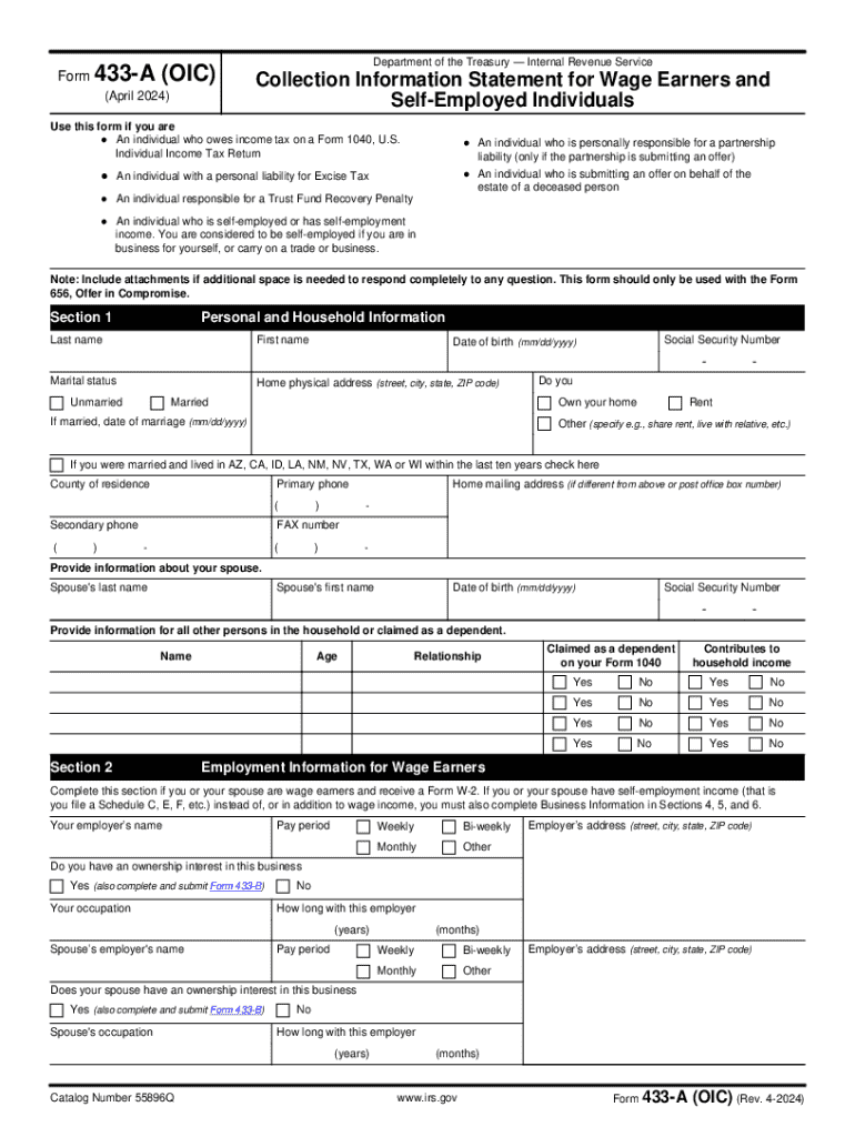 2024 Form IRS 433 A OIC Fill Online Printable Fillable Blank PdfFiller